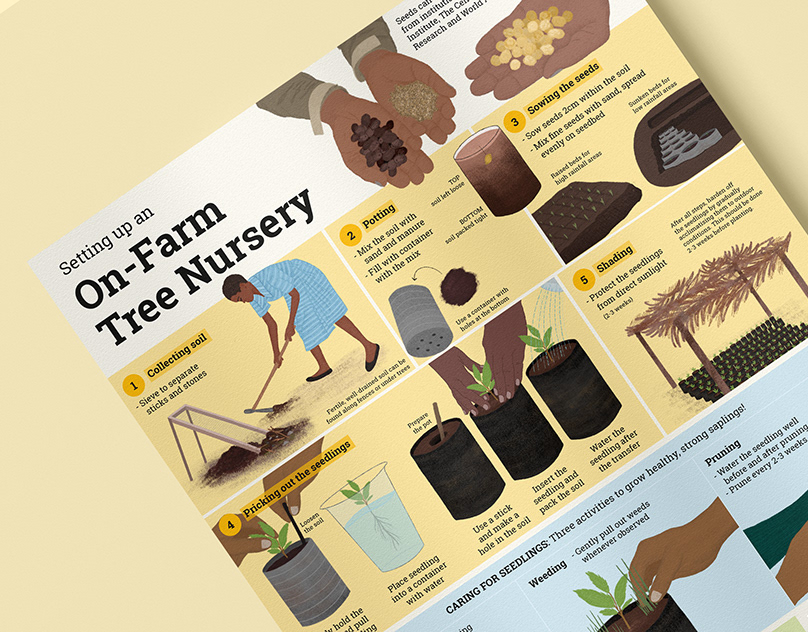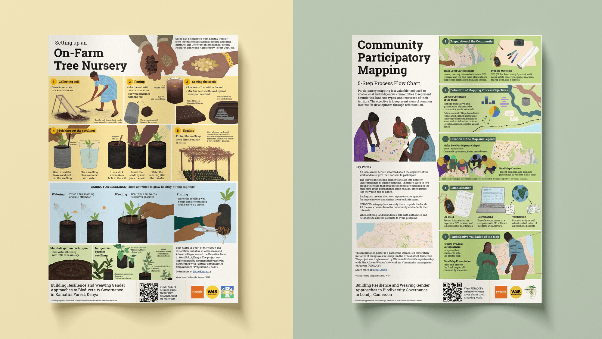Illustration, Women-Led RestorationIllustrated step-by-step infographics designed as practical tools for women-led restoration initiatives in Kenya and Cameroon, adapted for UN CBD COP16.